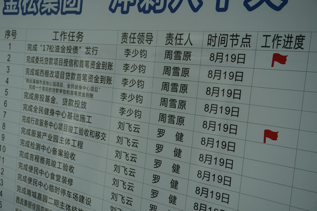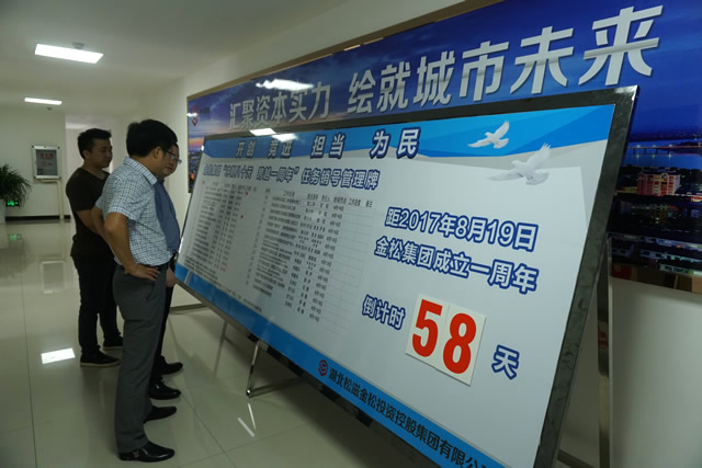 金松集團(tuán)“沖刺八十天 跨越一周年”活動(dòng)自6月1日正式啟動(dòng)以來,集團(tuán)公司各部室、各子公司迅速領(lǐng)受任務(wù),科學(xué)制定工作計(jì)劃,倒排工期,掛圖作戰(zhàn),確定的30項(xiàng)重點(diǎn)工作任務(wù)快速推進(jìn),項(xiàng)目建設(shè)呈現(xiàn)出“你追我趕”的強(qiáng)勁態(tài)勢(shì)。截止目前,10億元“17松滋金投債”發(fā)行和1.3億元白云新城棚戶區(qū)改造貸款項(xiàng)目?jī)身?xiàng)任務(wù)已率先完成。
