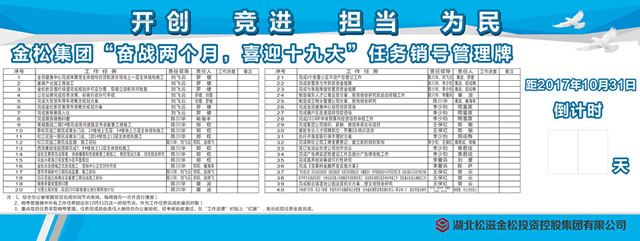 為落實(shí)市委、市政府“做優(yōu)做強(qiáng)做大金松集團(tuán)”的要求,加快企業(yè)轉(zhuǎn)型發(fā)展步伐。日前,金松集團(tuán)正式啟動(dòng)了“奮戰(zhàn)兩個(gè)月,喜迎十九大”活動(dòng),計(jì)劃從9月1日起至10月31日,全面完成40項(xiàng)重點(diǎn)工作任務(wù)。
