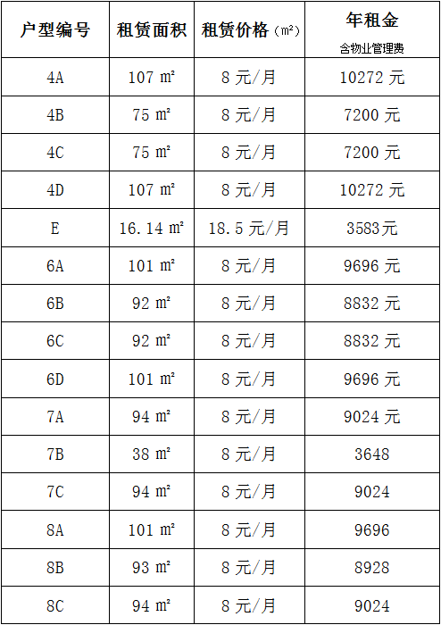 本次所有房屋均為現狀招租,意向承租戶自行現場踏勘。除E標外,其余只能作為居住、辦公等兩種用途,意向承租人按招商價格同物業(yè)公司洽談,洽談成功之后簽訂租賃合同,先到先得,租完為止。