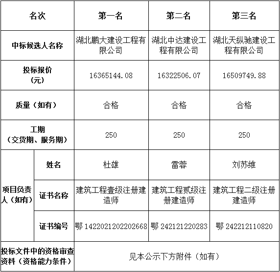 金投?彩虹灣一期(S1號(hào)樓綜合商業(yè))及配套工程于2022年12月19日在湖北省電子招投標(biāo)交易平臺(tái)發(fā)布招標(biāo)公告,2023年01月31日在松滋市開標(biāo)室(1)開標(biāo),并于2023年01月31日完成評(píng)標(biāo)工作。根據(jù)評(píng)標(biāo)委員會(huì)提交的評(píng)標(biāo)報(bào)告,湖北松滋金投置業(yè)有限公司已經(jīng)確認(rèn)評(píng)標(biāo)結(jié)果,現(xiàn)進(jìn)行評(píng)標(biāo)結(jié)果公示。