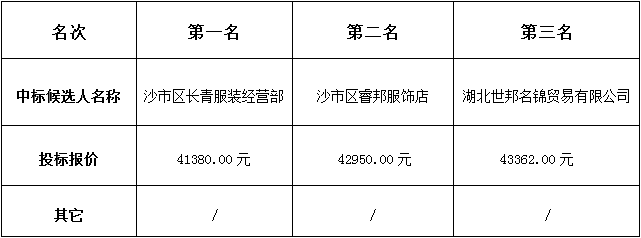 金投物業(yè)員工工作服裝采購項目于2018年12月3日發(fā)布詢價邀請函,2018年12月7日在松滋市稻谷溪城市濕地公園會議室進(jìn)行評標(biāo)。根據(jù)評標(biāo)小組提交的評標(biāo)結(jié)論,湖北金投物業(yè)管理有限公司已經(jīng)確認(rèn)評標(biāo)結(jié)果,現(xiàn)進(jìn)行中標(biāo)候選人公示。